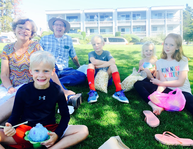 A treat for me was all of the blackberry bushes in full bloom everywhere you looked! I absolutely adore blackberries and it was so fun to go on hikes collecting berries to eat and for milkshakes. This is one of my most treasured childhood memories for sure and it was so fun to share with the kids. Typically, the blackberries are not ripe when we arrive in Seattle! The kids enjoyed walking all over the place, especially down to Sunnyside beach to look for crabs and skip rocks. They enjoyed blueberry picking as well and of course baking a blueberry pie once all the berries were collected with Grammy! My mom always tries to give each of the kids a special one on one baking session. Grant picked chocolate chip cookies; Dane picked a blueberry pie. This year, Ev skipped the baking in leu of sewing an adorable little doll. This was such a fun project for her and she was thrilled! My Dad taught Evelyn how to make gyoza-- another childhood favorite of mine. He served his mission in Japan and used to make this for us on special occasions. So fun to teach the kids the whole darn process-- which isn't easy at all- ha!